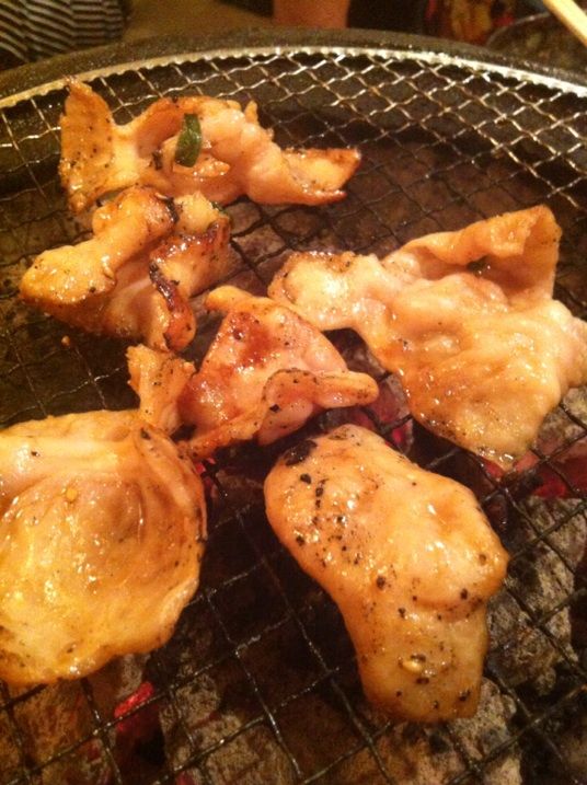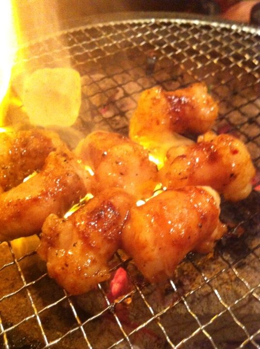 炭の上で焼くと、コロンコロンと小腸壁が縮まり、中の脂肪がぷっくりとふくらんで来ます。