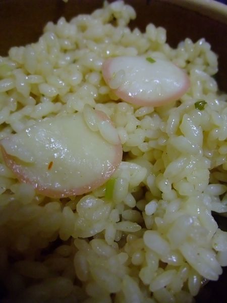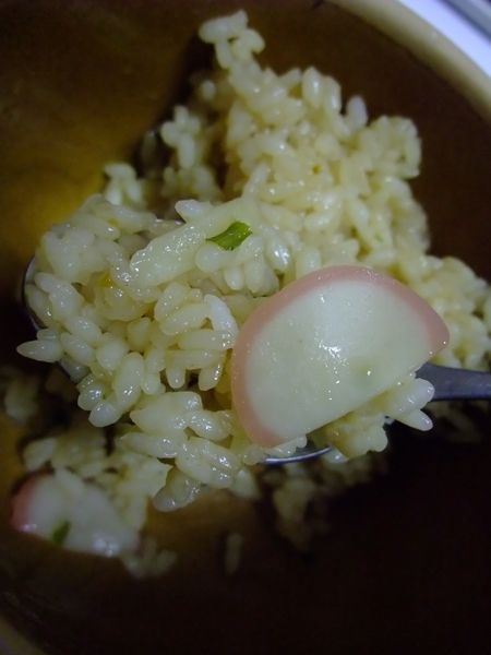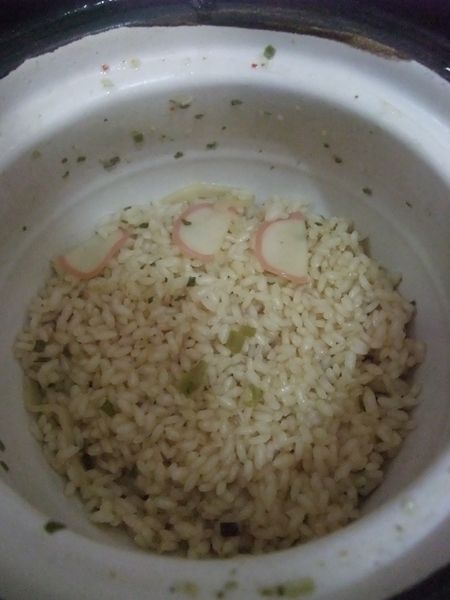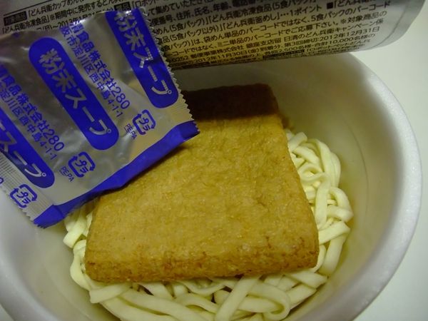 炊く前のコメ、「どん兵衛きつねうどん」のスープの素(袋約半分量)、あとうどんの下に隠れていたカマボコ(とうどんの切れっ端)を入れて、