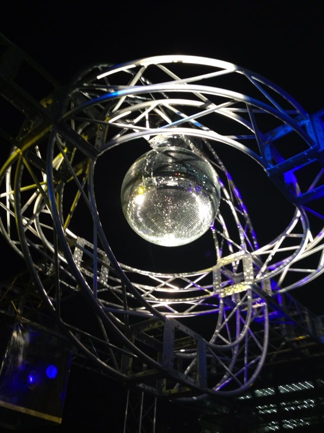 巨大ミラーボールが夜空の下、キラキラに輝いている!