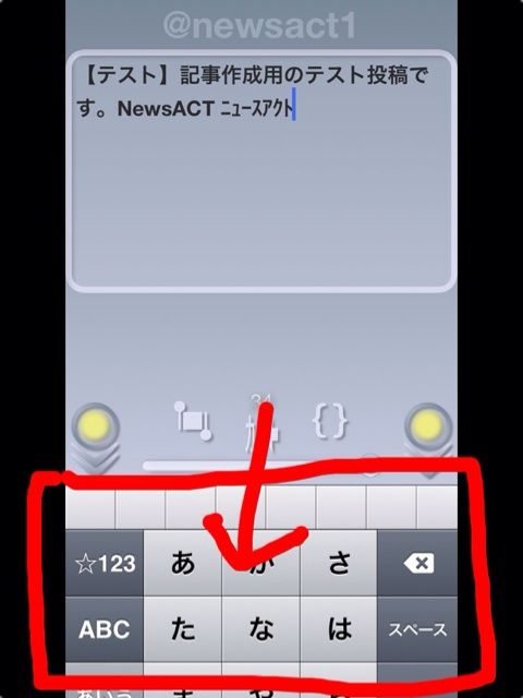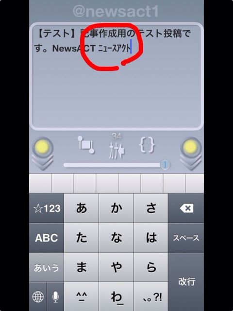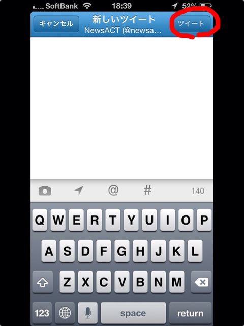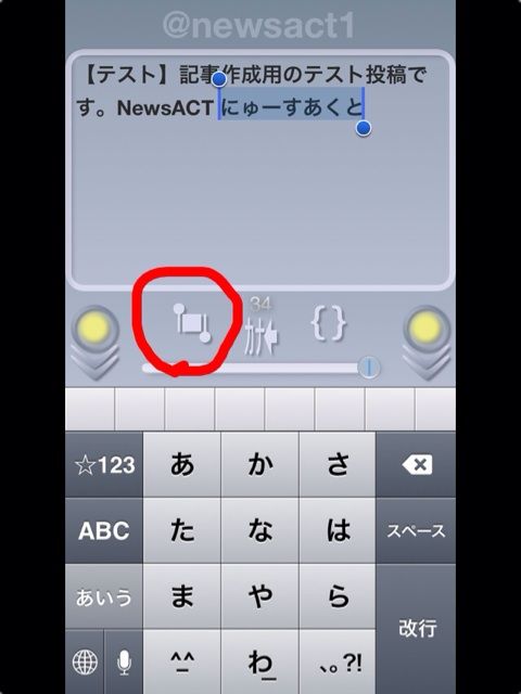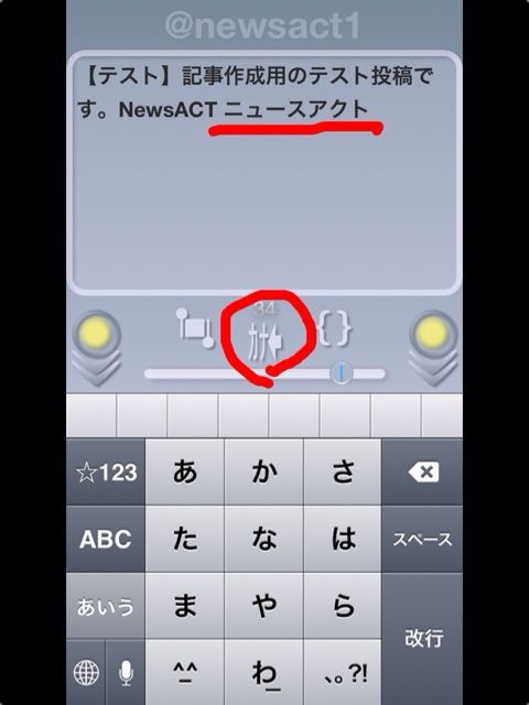 そのツイート方法は、文字を書いたあと、丸く囲った部分をタップし、下にスライドするだけ。