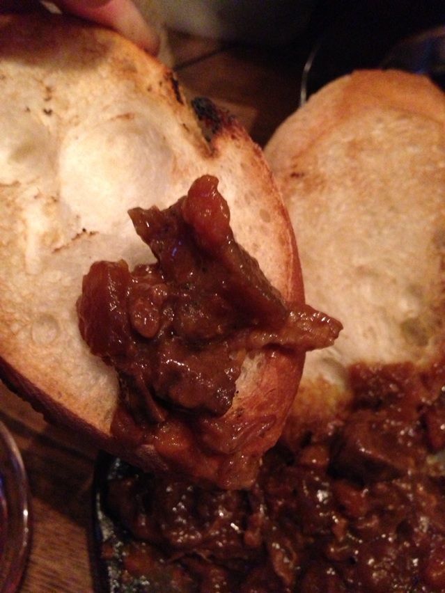 もつカレーは小鉢に盛られ、焼いたフランスパンが添えられている。
