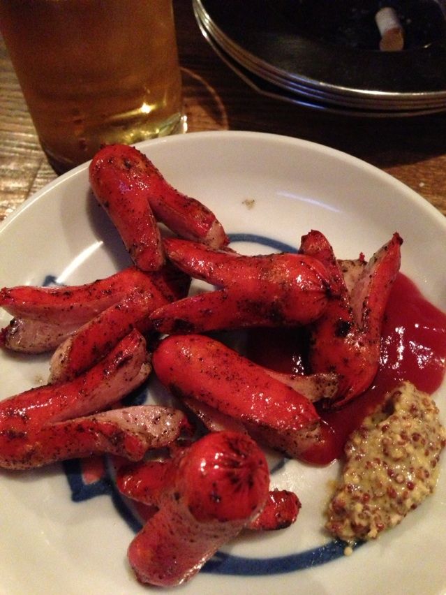 焦げているのではなく、いい具合に黒く汚れた赤ウインナーは、フライパンではなく炭・網焼きなのだろうか。