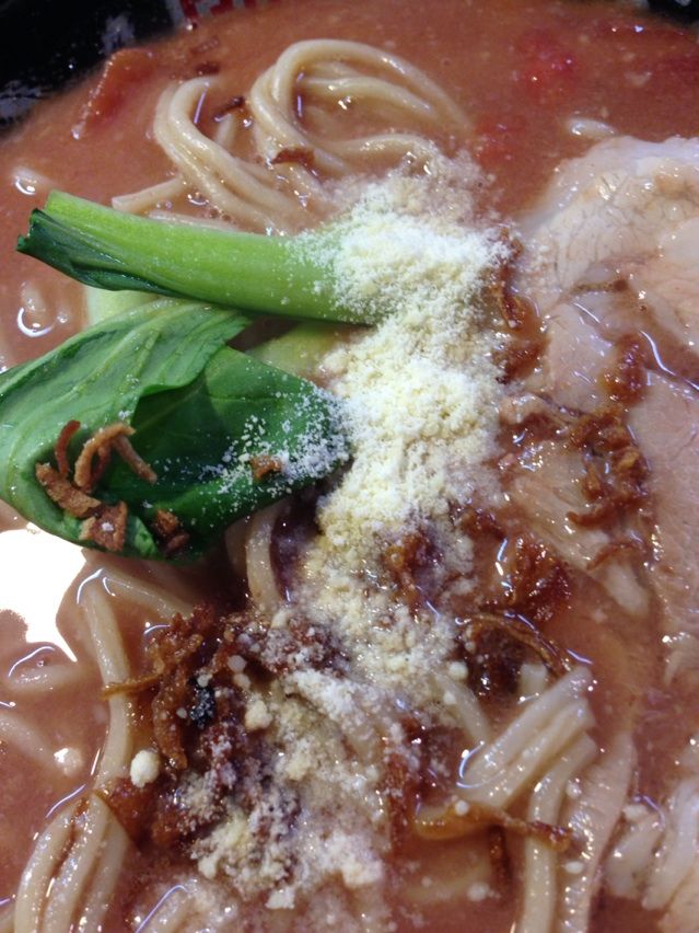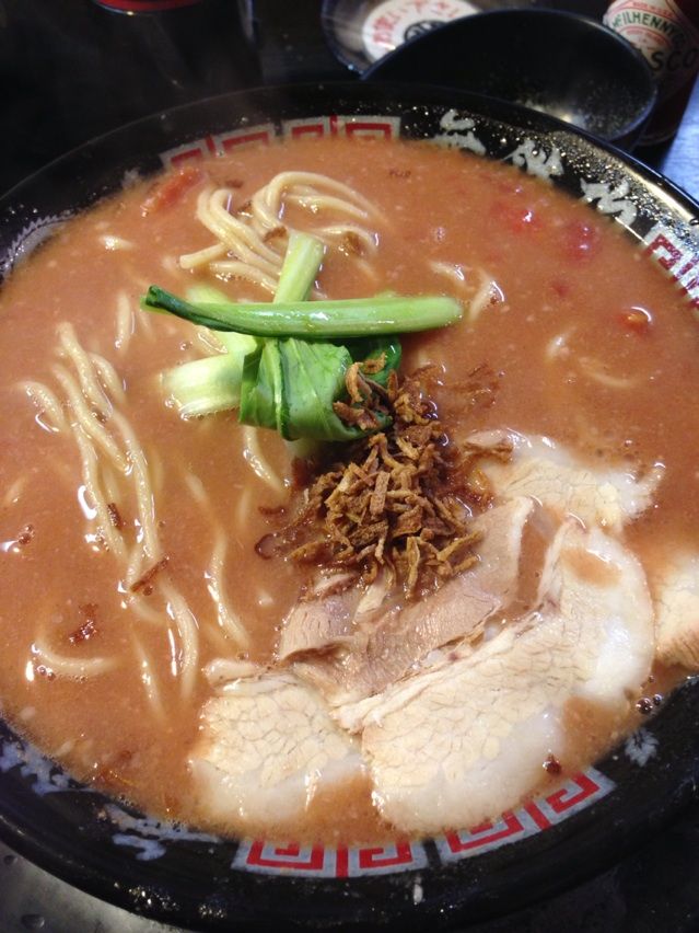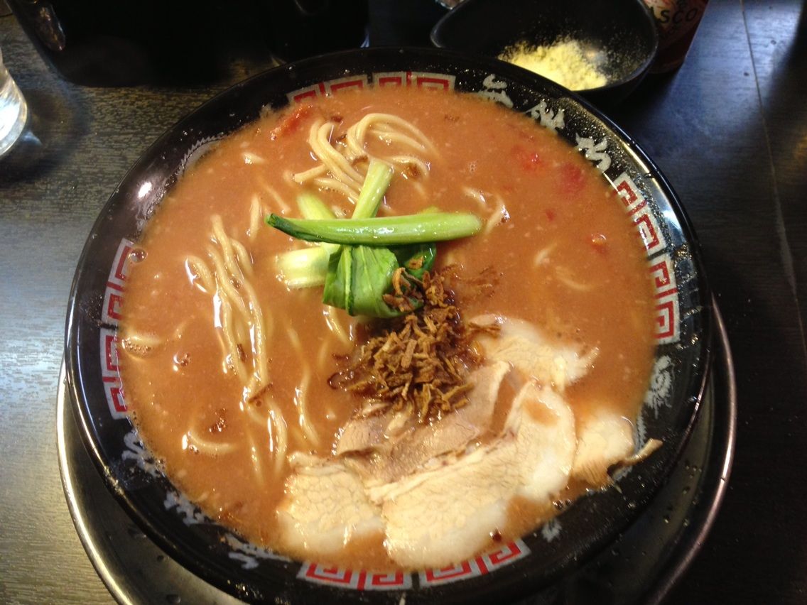 見た目は写真を見てのとおり、赤味がかった濃厚スープにチャーシュー・青菜・フライドオニオン。