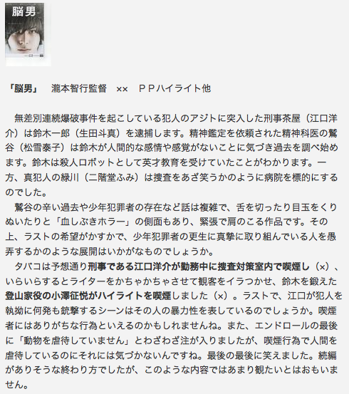 例えば比較的新作である「脳男」に関しては、ブログ筆者はこう評します。
