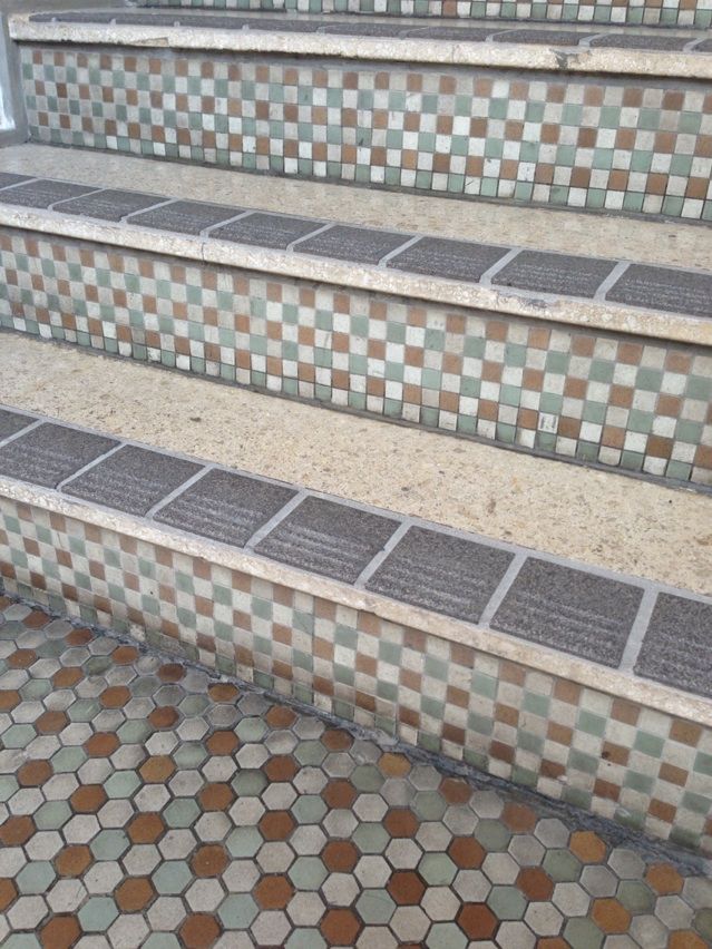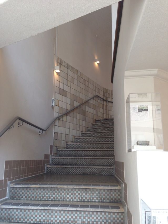 この六角形の床タイルと、階段壁の四角のタイルが当時のものです。