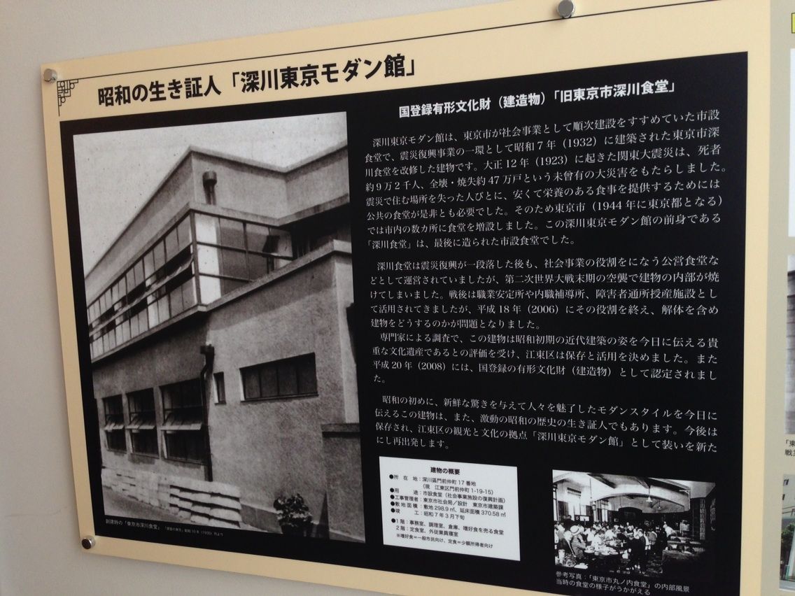 昭和12年(1937)に廃止となりますが、その後も深川栄養食配給所などと名称を変え、安く食事を提供する場として存続しました。第二次大戦後は、東京都立内職補導所、江東区の福祉作業所などに活用されてきました。平成20年(2008)、震災復興建築物として希少である点などから国登録有形文化財建造物に登録され、翌21年10月10日に深川東京モダン館として開業