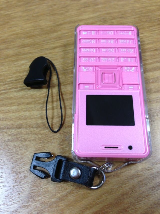 ストラップ紐で、カバンや、場合によっては2台持ちの普通サイズの携帯にストラップフォン2をくくりつけ、使用時はフックを取り外し、使うというわけだ。