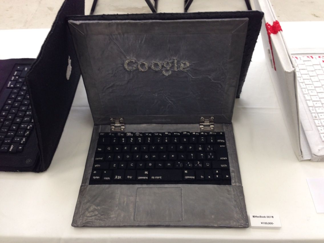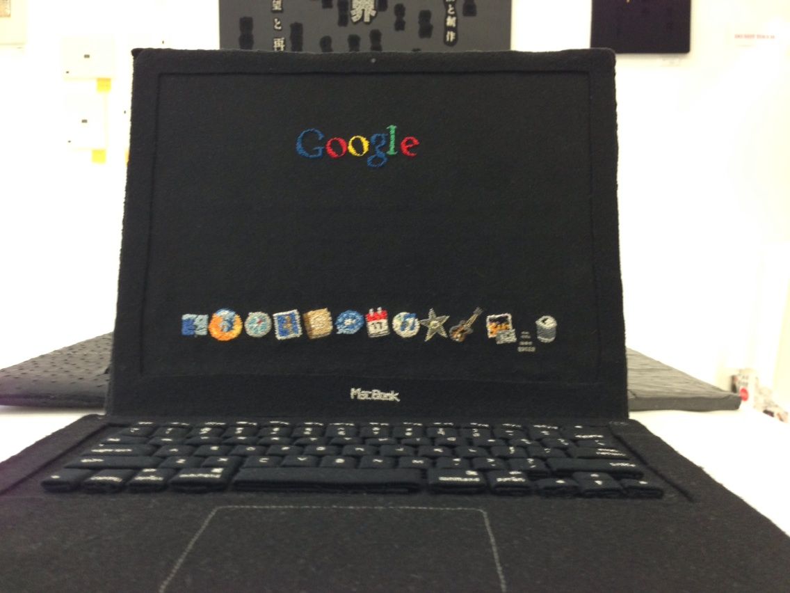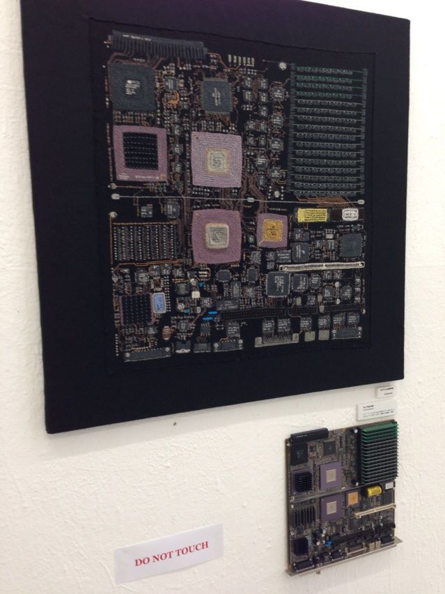 MacBook・iPodがモチーフの刺繍作品や、Appleのロゴがモチーフの文字刺繍、また基盤そのものなどが展示されています。