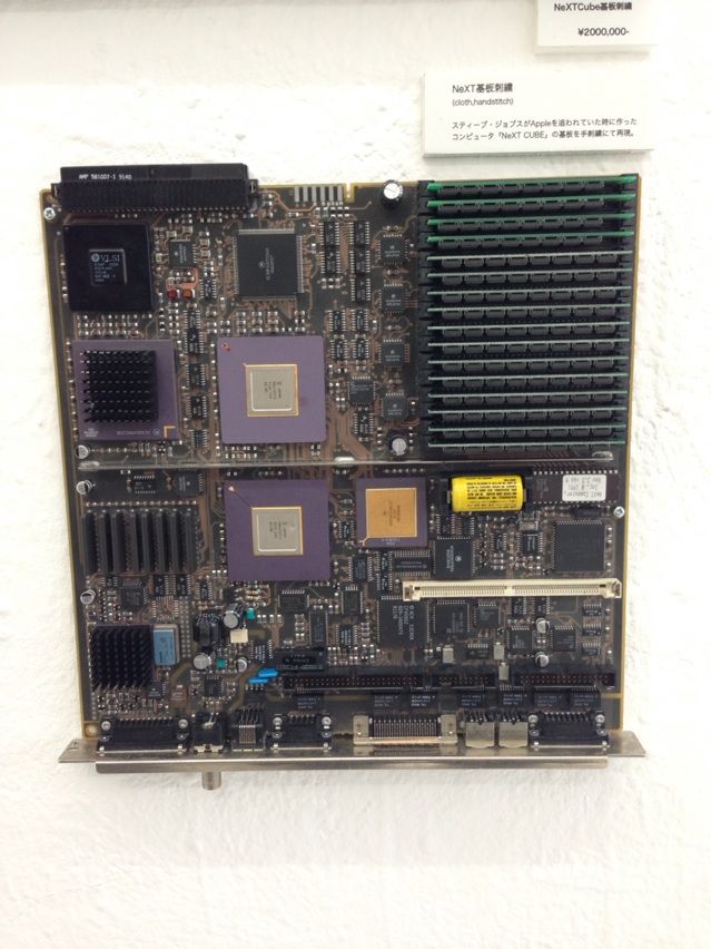 スティーブ・ジョブズがAppleを追われていた時に作っていたワークステーション「NeXT CUBE」の基盤をモチーフにした、「刺繍する犬」さんの代表作ともいうべき手縫い刺繍作品。