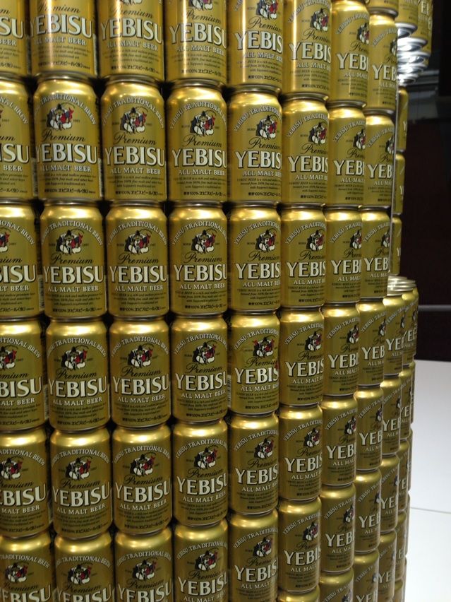 ヱビスビールの缶で出来た巨大なヱビスビールモニュメントと、