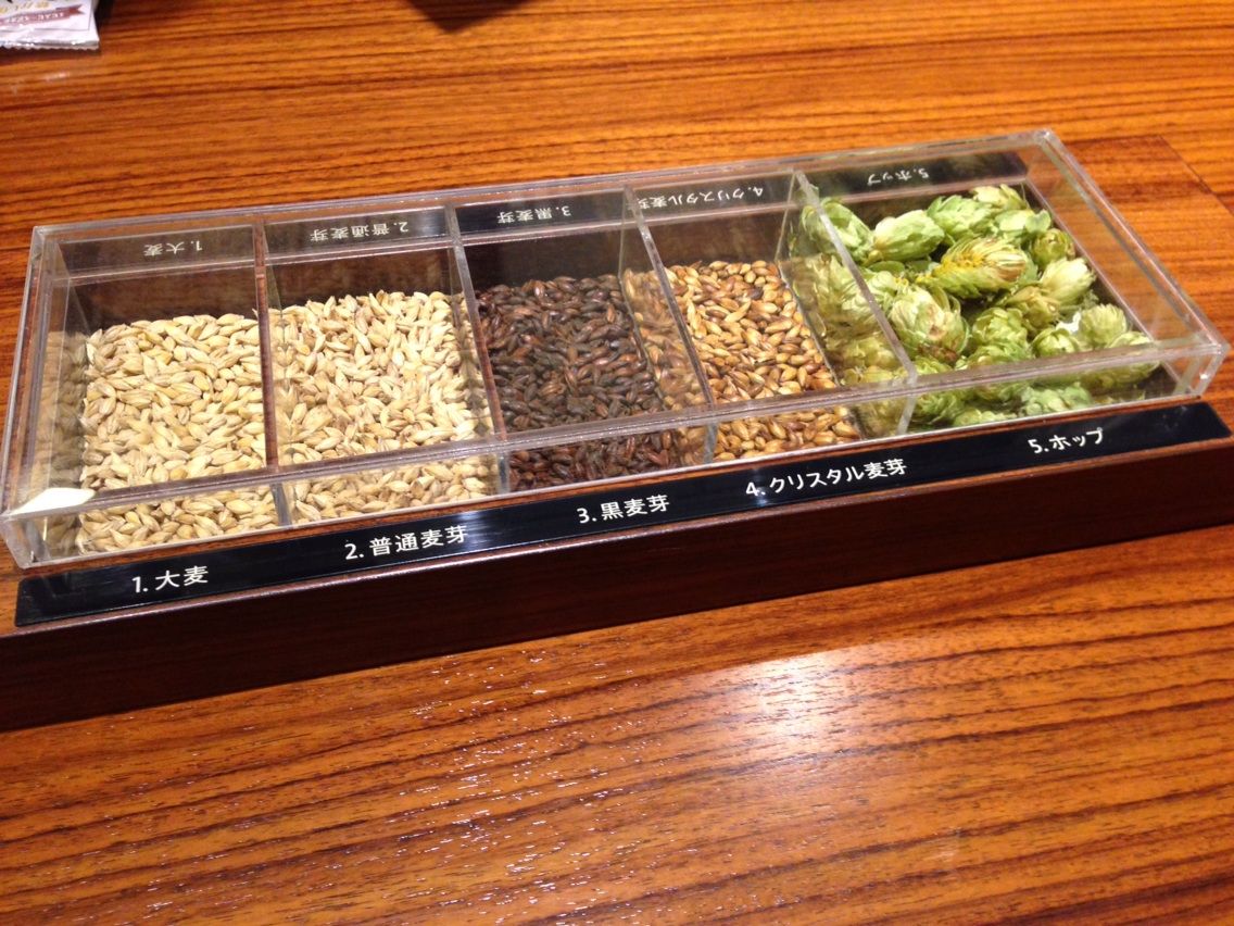 卓上のビール材料・大麦麦芽の展示は、ヱビスビール、琥珀ヱビス、ヱビス黒など、ビールの色味が何で変わるか、という説明の為のもの。