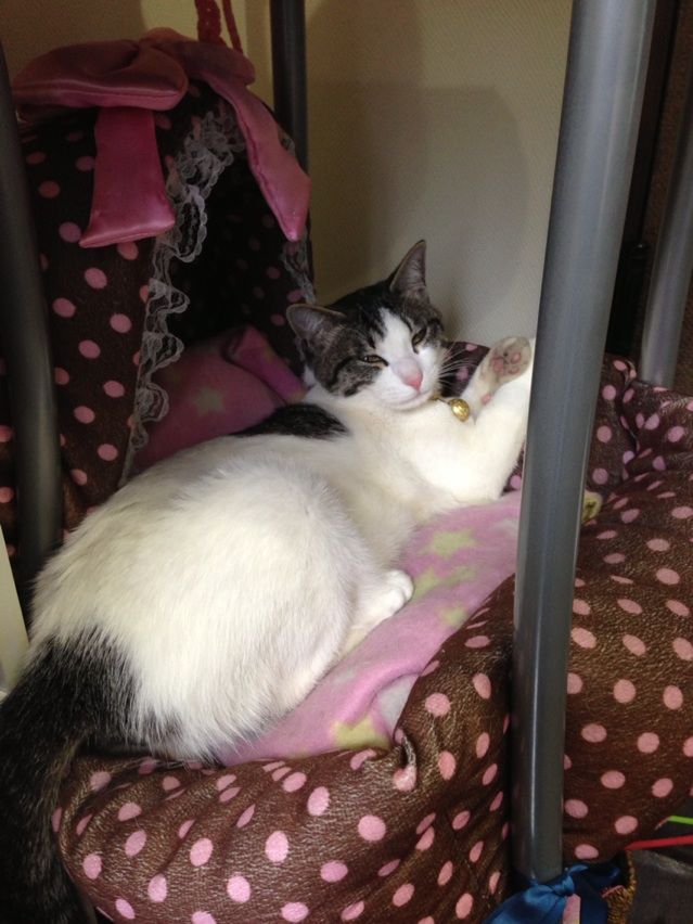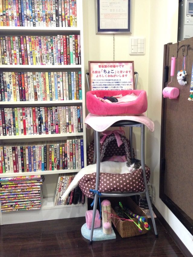 お店のフロアの一角には彼女「ちょこ」ちゃんの住まいが用意され、日中の大半はここでゴロゴロ寝ております。