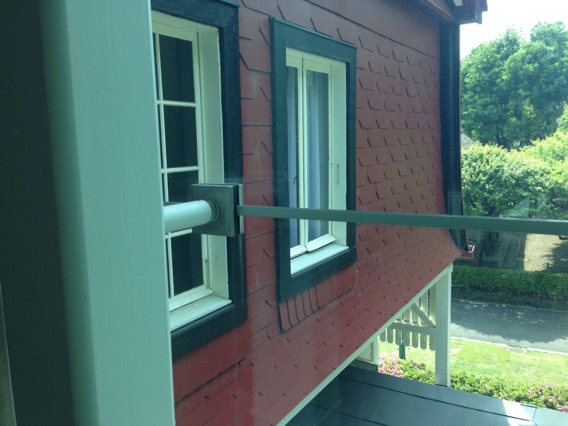 この写真はエレベーターホールのガラス窓から、デ・ラランデ邸2階部分を見たもの。
