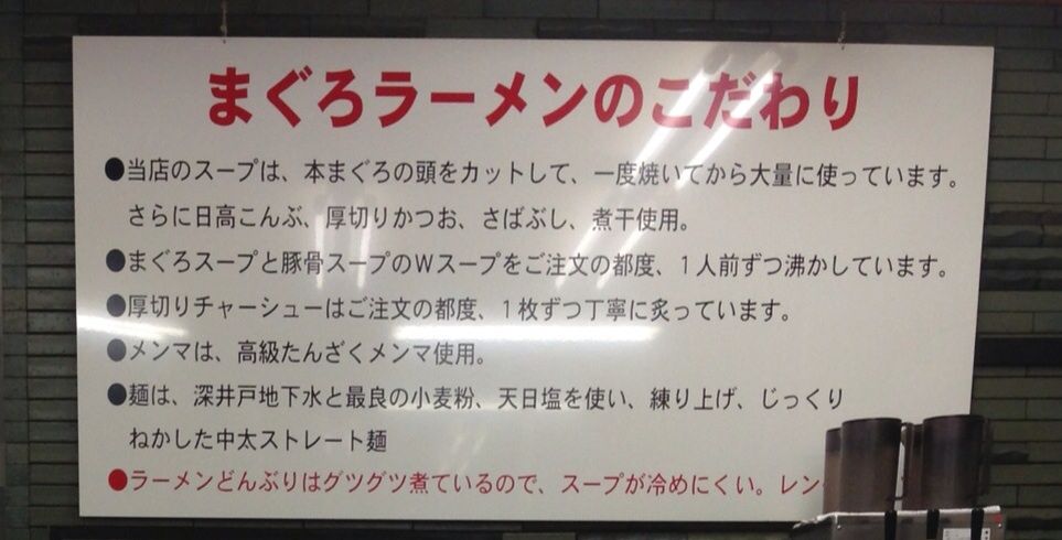 ・スープはまぐろスープと豚骨スープを、注文のたびに一人前ごとに沸かす。