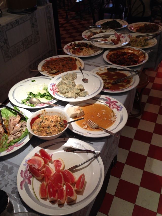 お店の奥に配置された大皿から好きな料理を各自取る、いわゆるバイキング形式。