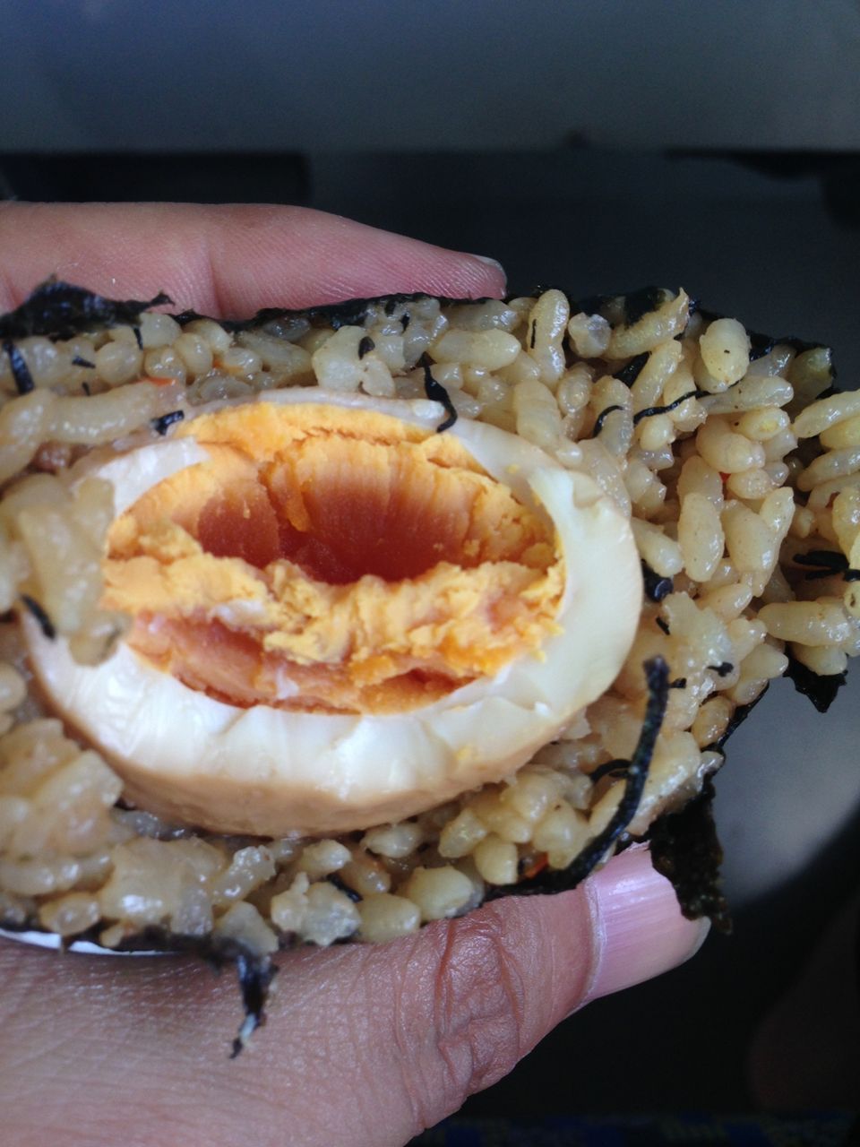 出汁を吸ったごはんに、煮玉子の入ったおむすび。