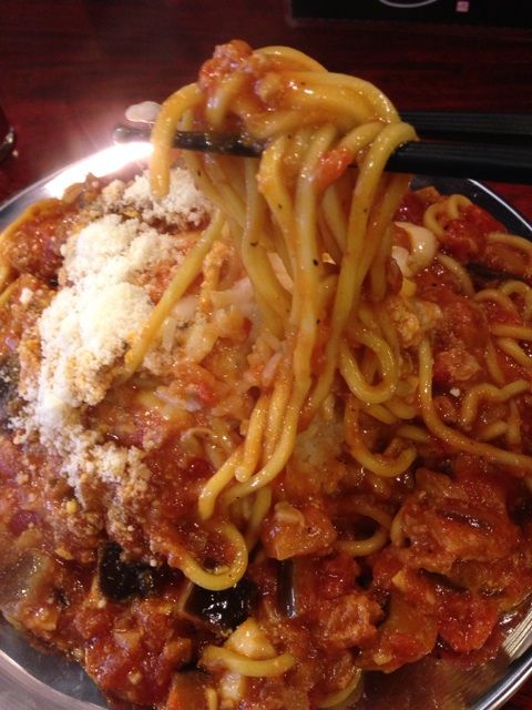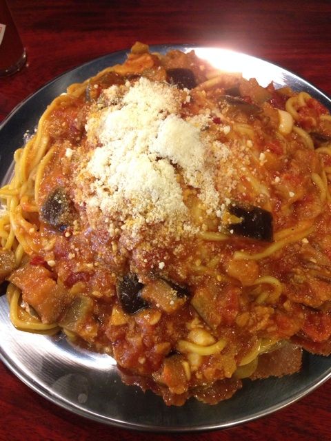 茄子やトマト、チャーシュー、そして粗みじんのニンニクと、輪切り唐辛子入りのイタリアン風トマトソースを鍋で煮て、ラーメンよりやや早めに上げられた中太麺を鍋に投入。サラッと混ぜ合わせてから皿に盛られたものです。