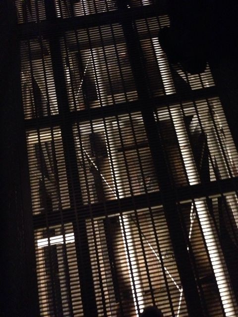 格子状になった廊下。足元にも樽が見えますね。