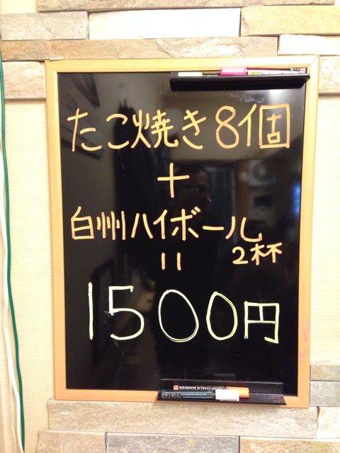 たこ焼き8個(520円)+白州ハイボール(600円)2杯=1,500円(それぞれ単品で頼むと1,720円)。
