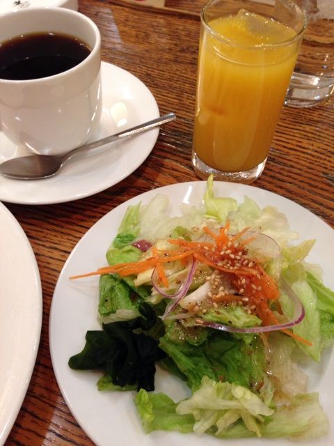 サラダは別盛りで、もちろんコーヒーの他に、オレンジジュース付き。