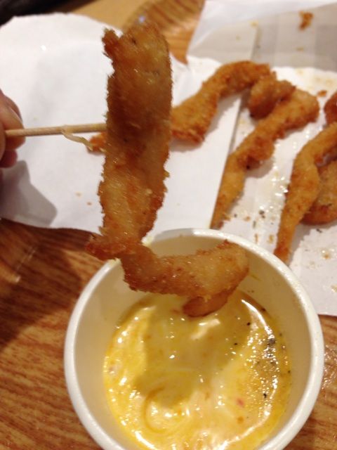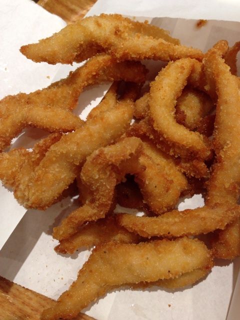 鶏肉の部位で言うと「ササミ」の唐揚げ。確かにササミとは「笹身」。笹の葉のような形をしているためにそう呼ばれるようになった身ですが、いくらなんでもこれ細すぎないかい?w