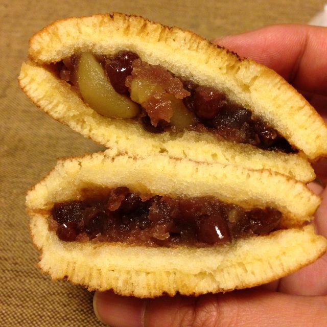 オニどらを割るとふっくらとした生地に包まれた粒あんが入っています。