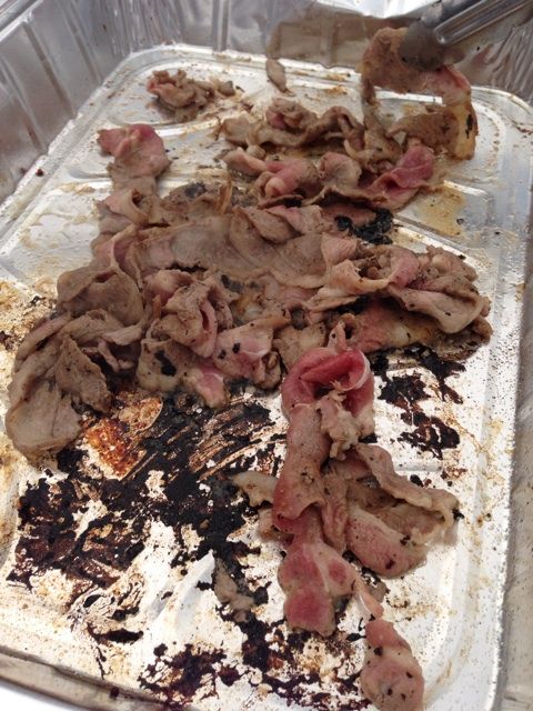 天井も低く、風が抜けるとはいえ排気施設はありませんので、つまり肉を焼く煙はテント内をこもりがち。