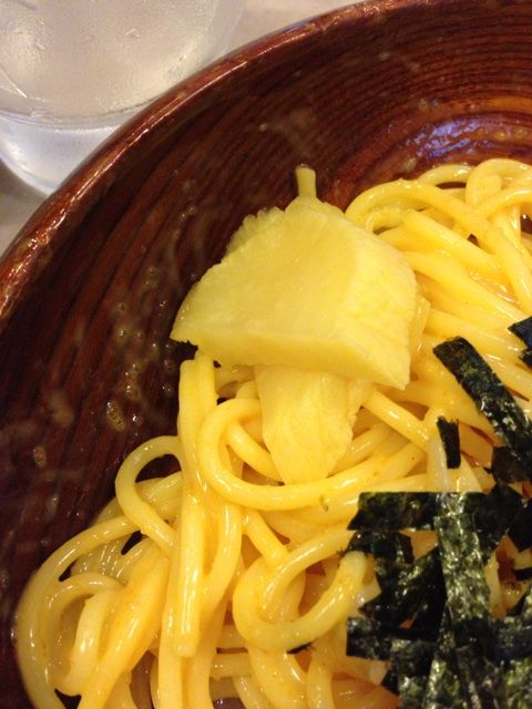 クリームソースに絡んだたらこ、イカ。そしてソース自体が、ウニのせいかやや黄色ががっています。