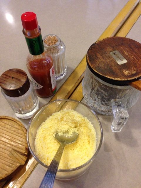 卓上には粉チーズ、タバスコ、そして「ゆかり」。