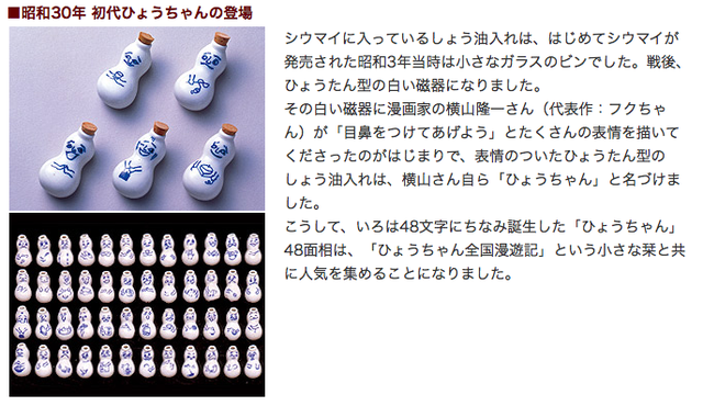 シウマイに入っているしょう油入れは、はじめてシウマイが発売された昭和3年当時は小さなガラスのビンでした。戦後、ひょうたん型の白い磁器になりました。(画像キャプチャ、及び引用は崎陽軒公式サイトより)