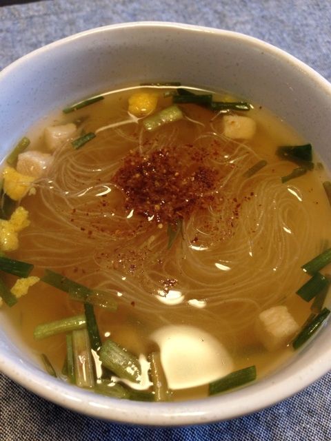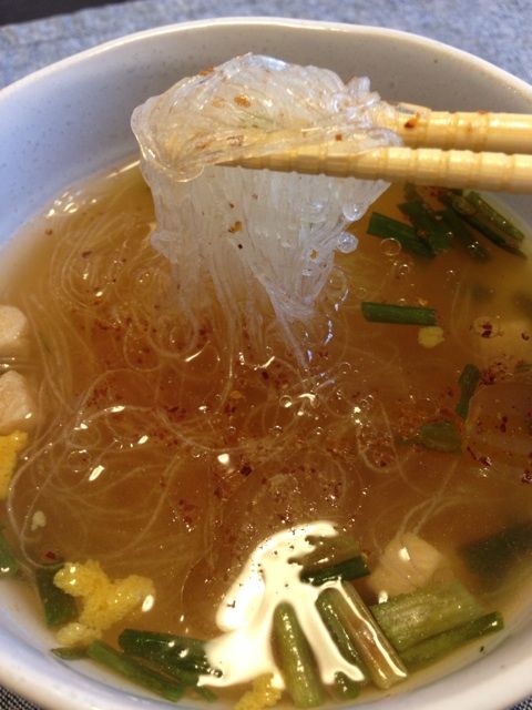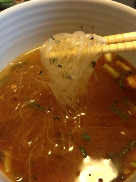 見てのとおり、唐辛子の粉末がスープに浮き、春雨にまとい付く。