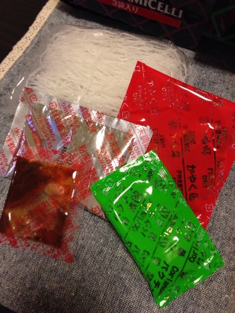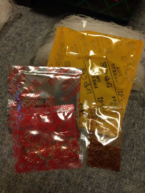 春雨と乾燥かやく、粉末スープ、調味油と唐辛子粉末。