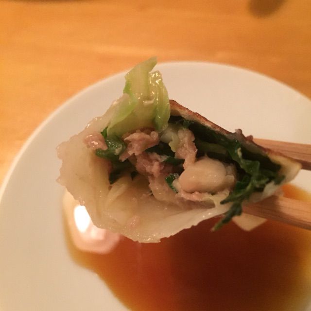 大葉一枚を巻き込んで包んでいる餃子は、餡の肉は普通の挽き肉ですが、野菜はザク切り。