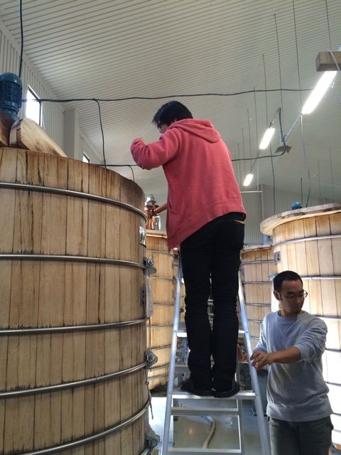 仕込みの過程で麦汁になり、この大きな樽…ミズナラの発酵槽の中で発酵が進みます。