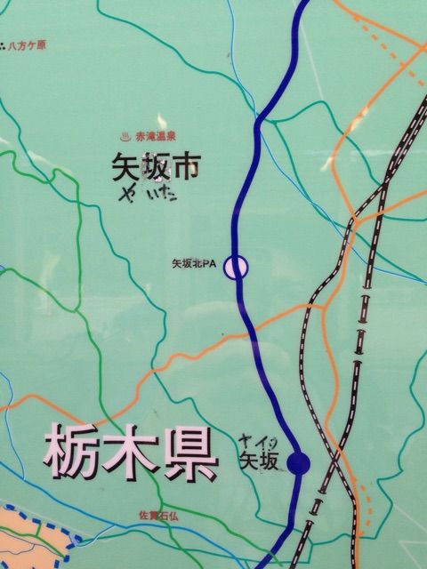 栃木県矢板市を、案内看板上で「矢坂」と誤字。