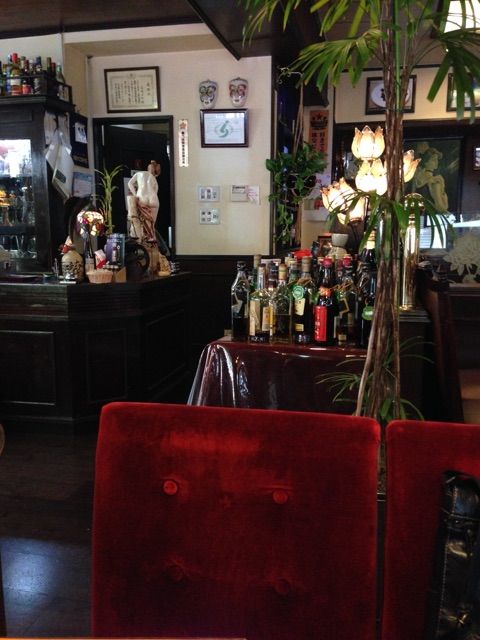 うん、ちょっと派手めな純喫茶という感じ。だがよく見てみれば、奥にはバーカウンターが。しかもけっこうボトルが充実してる。