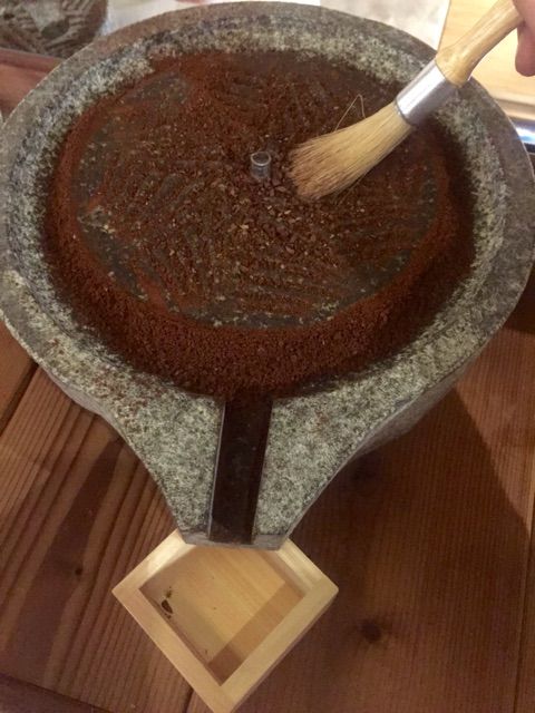 気がついたら升全部の豆を挽いてしまいました。30粒ほどが目安……と言われたのに、石臼を挽くという非日常感が楽しく、つい一心不乱に回しまくってました。