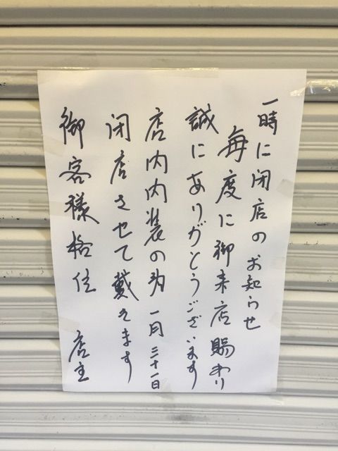 1月31日付の張り紙によると、「店内内装の為」「一時閉店」。完全閉店ではなく、リニューアルオープンを匂わせる文面となっていました。