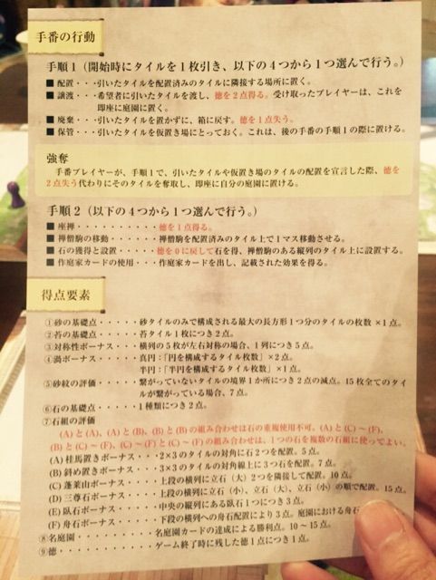 手番での行動。ゲーム終了時のポイント計算。これがものすごく煩雑で、ここで全て紹介してもきっと魅力は伝わらないはず。