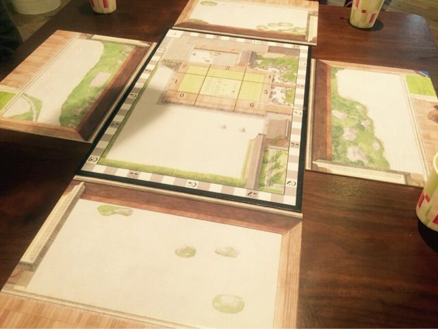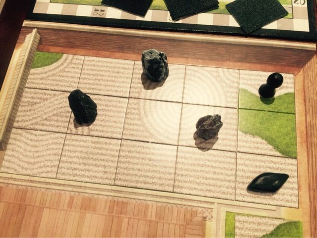 さて、これがプレイボードです。中心に「寺院ボード」。各プレーヤーの前には「庭園ボード」。ここにカード型の砂紋タイルを嵌めていき、”美しい庭を作った者が勝ち”という極めて特殊なゲームです。