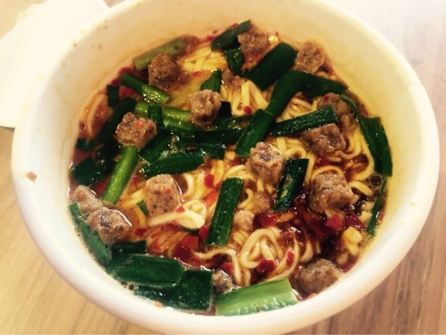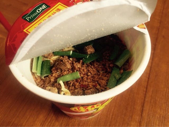 フタを開けると、麺が見えないほどの具が入っています。挽き肉とニラ。うむ、これは台湾ラーメンだ。