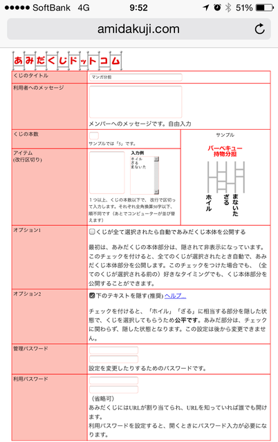 トップページの「あみだくじを作成する」をタップ(クリック)すると、この画面になります。