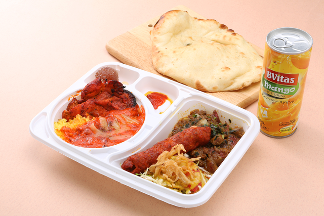 「マダル」とは「母さん」の事。インドのお母さんが作ったお弁当のイメージ。定番のバターチキンカレーにナン、シックカバブとボリュームも充分。さらにマンゴージュース付きです。