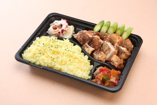 チキンのオーブン焼きにサフランライス。夏野菜のイタリア風煮込み・カポナータやタコのマリネが駅弁ながらイタリアンの挟持の見せ所か。
