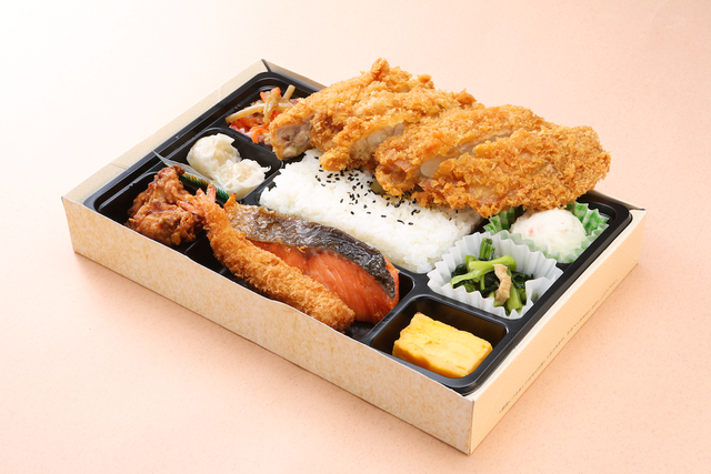 問答無用のジャンボチキンカツが目を引く幕の内弁当。お店では栄養士監修の手作り日替わり弁当からこのようなボリュームたっぷり弁当まで、冷めてもおいしいゴハンで提供しているそうです。