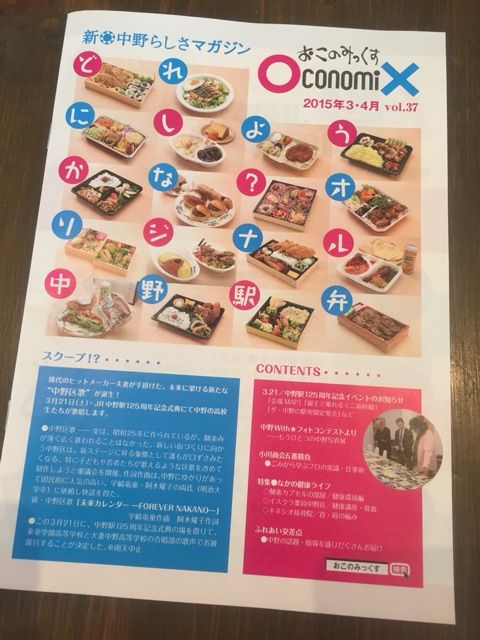 中野の地域情報フリーペーパー「おこのみっくす」。その3月・4月号の表紙は、「ザ・中野の駅弁」。