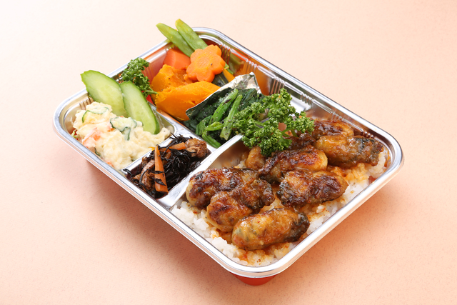 ザ・居酒屋の駅弁。味噌ダレの牡蠣がこんなに乗っている豪華仕様。ポテトサラダも居酒屋の定番メニューですよね。