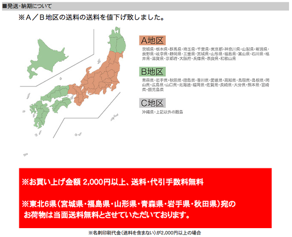 「名刺shop.com」での配送料は関東近郊A地区なら1配送360円という格安の料金なんですが、名刺印刷代金2,000円以上の場合、送料も代引手数料も無料になるからです。
