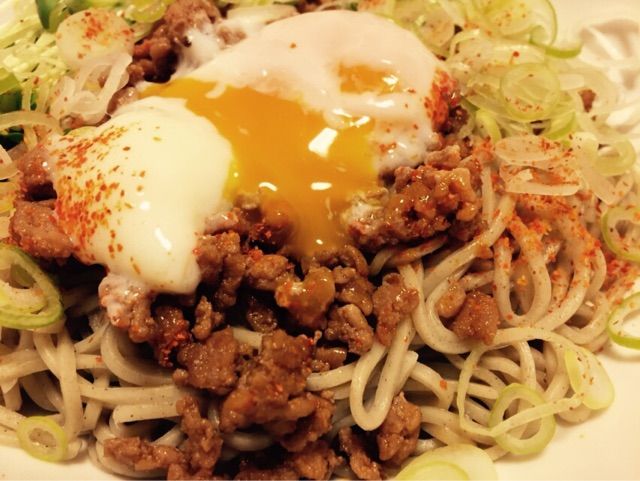 あとは温かい蕎麦の上に味付けし炒めた挽き肉をのせ、野菜や温泉玉子などのトッピングをオン。