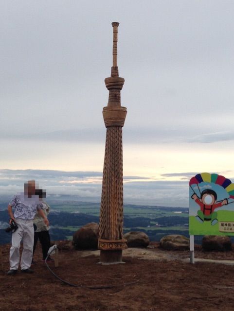 上越市吉川区の尾神岳(757メートル)に、モニュメントが設置された。尾神岳ファンクラブの依頼で、同区内の江村康成さんがチェーンソーで原木を彫って作った。標高をイメージしやすいよう東京スカイツリーを模した。